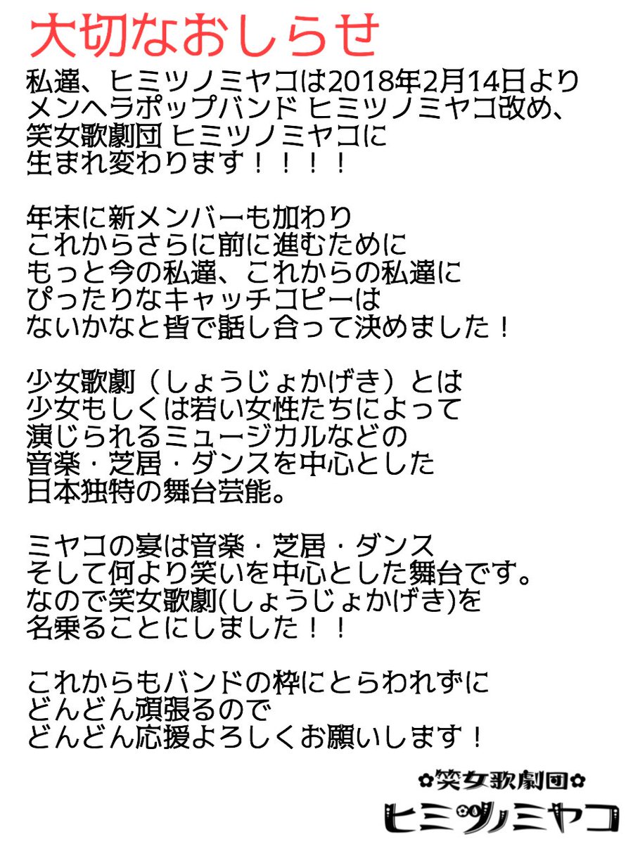 笑女歌劇団 ヒミツノミヤコ 公式 على تويتر 大拡散希望 Rt願 本日よりヒミツノミヤコは メンヘラポップバンド 改め 笑女歌劇団 に生まれ変わります 詳しくは画像を読んで下さい それに伴い 次回3月2日の 新宿loft宴より 新ロゴステッカー発売決定