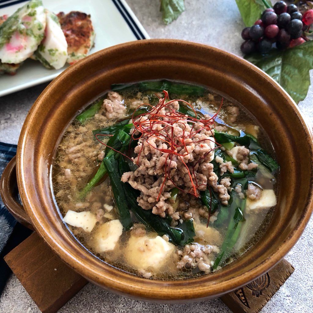 栄養士そっち V Twitter しびれ鍋自作 カルディのしびれ鍋の素美味しかったので模倣です ひき肉300gとニンニクみじん切りをごま油で水500ml 中華の素大さじ1 炒めニラ1束 豆腐一丁 味噌大さじ2 ナンプラー大さじ2 オイスターソース大さじ2 紹興酒大さじ2で