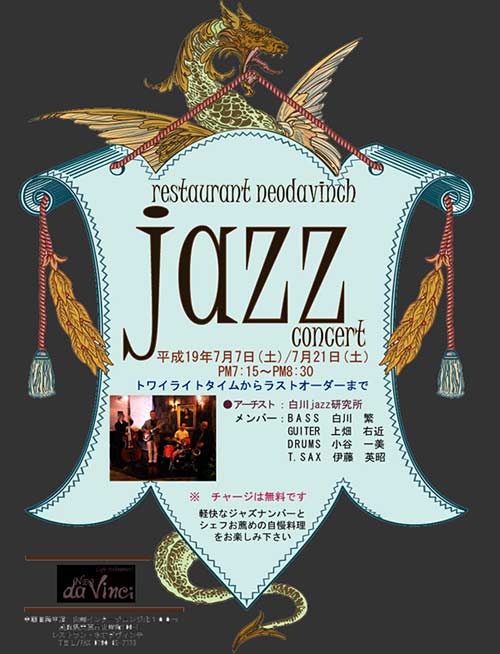 ネオダヴィンチ ジャズコンサート 第2弾開催 レストラン ネオダヴィンチ Neo Davinch