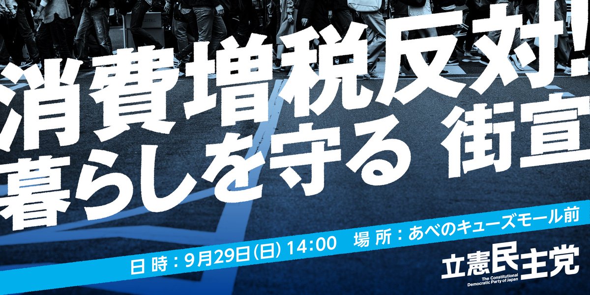 立憲民主党 りっけん 大阪府連 街頭宣伝のお知らせ 消費増税に反対する緊急街宣を開催します 市民スピーカーと共に増税反対と税金の使途について訴えます ぜひお集まりください 日時 9月29日 日 14時スタート 場所 あべのキューズ